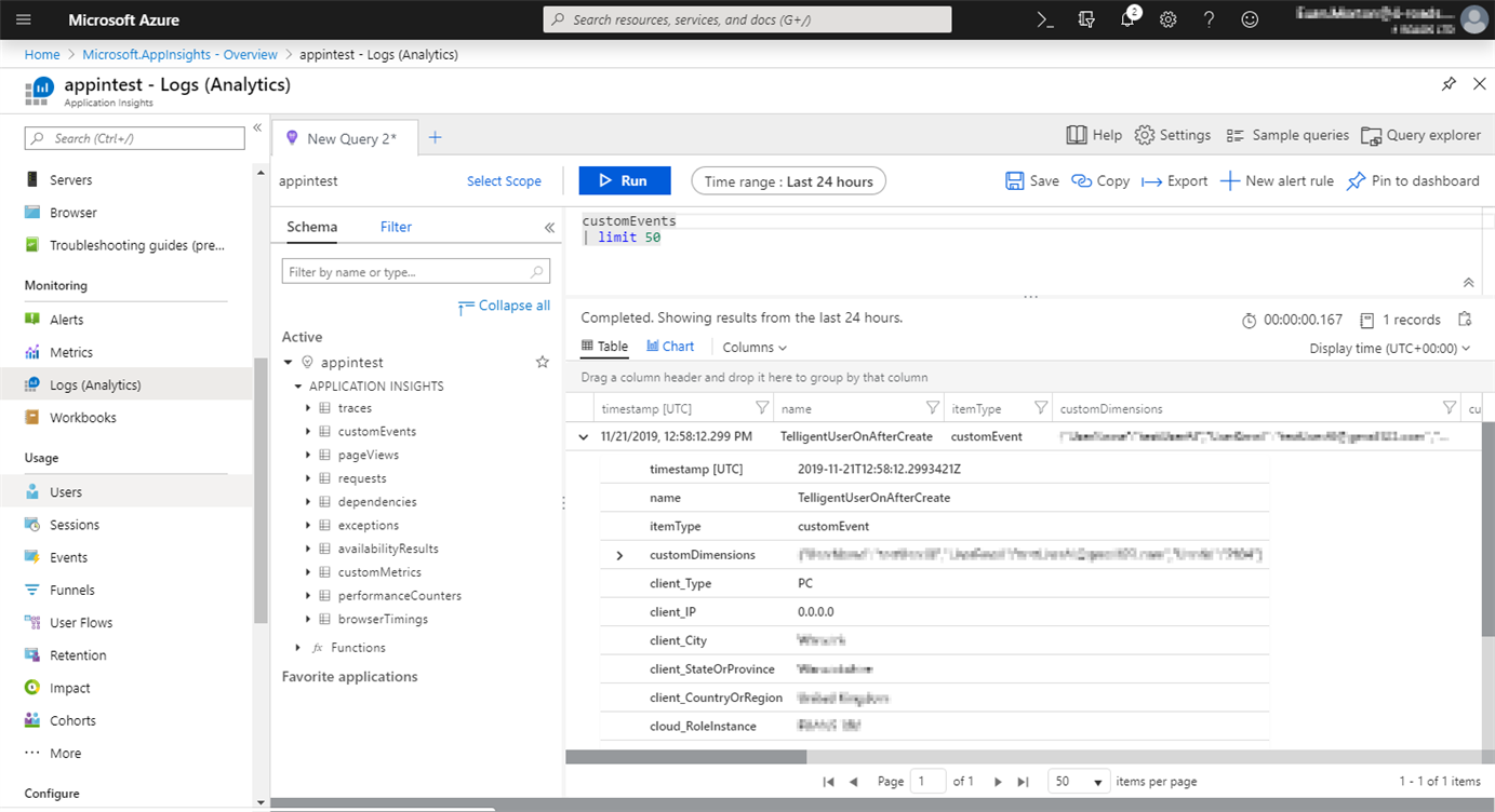 3. These logged events can be found in the side menu of Application Insights on Azure: