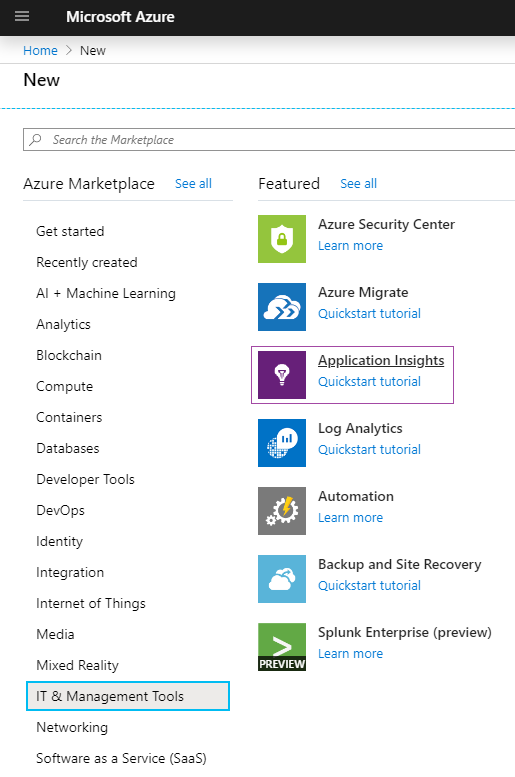 1. In Microsoft Azure create a new resource of Application Insights